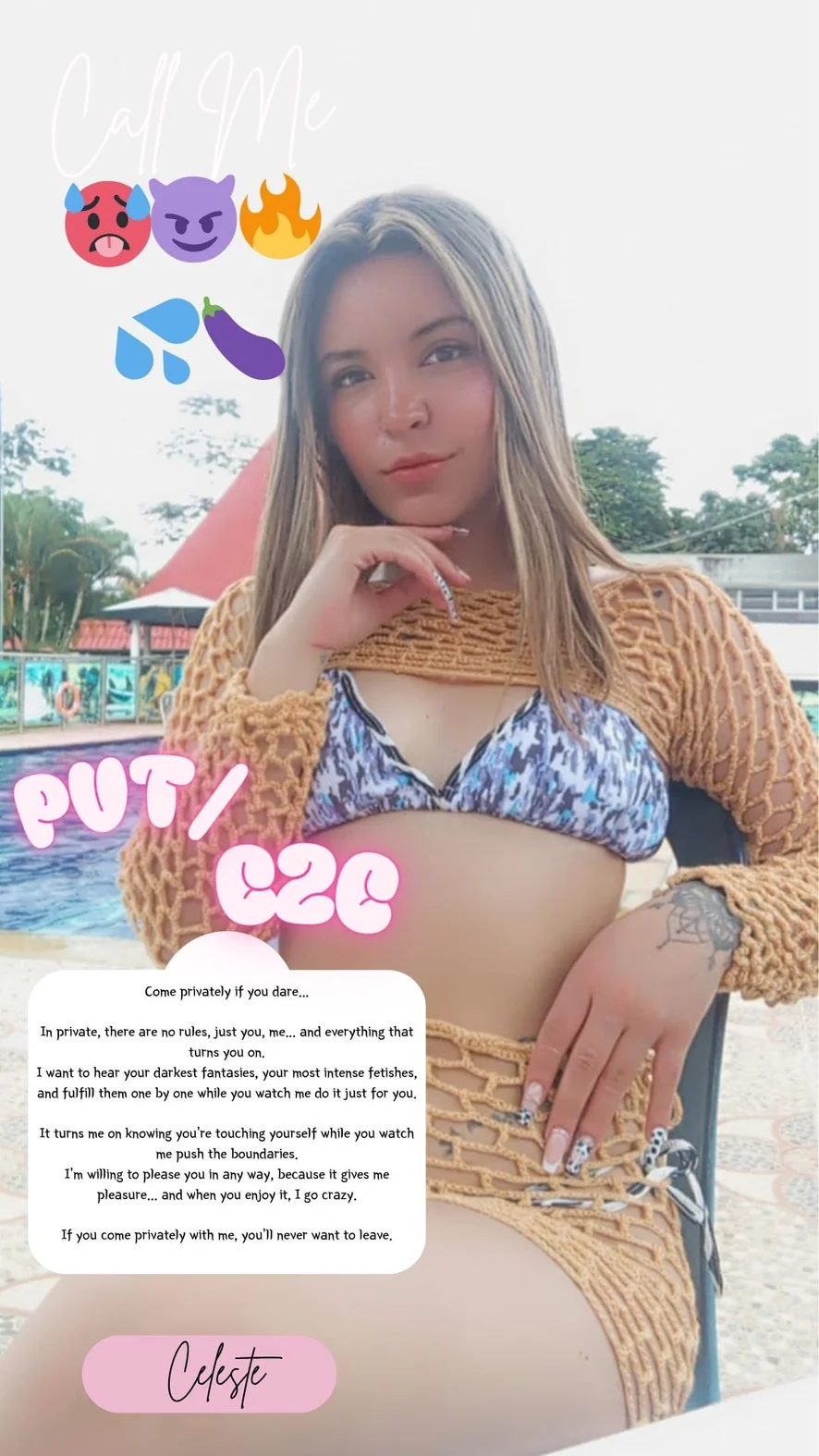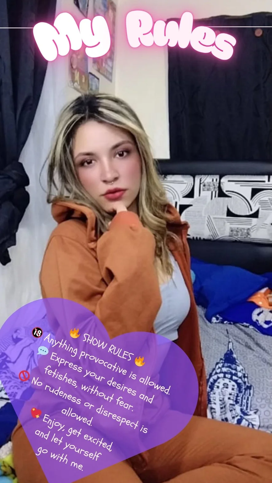 Ahegao, Buiten, Cameltoe, Rokje omhoog, Twerken, Op z'n Hondjes, Erotische dans, Spanking, Vingeren, Dildo of vibrator, Striptease, Masturberen, Dirty Talk, Voetfetisj, Roken, Seksspeeltjes, Tietneuken, Orgasme, Olie show, Topless, Squirten